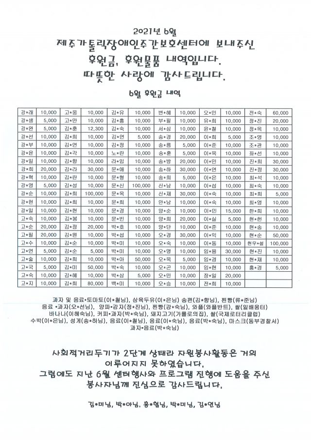 6월 후원금품 지원 및 자원봉사에 참여해주신 분들입니다.