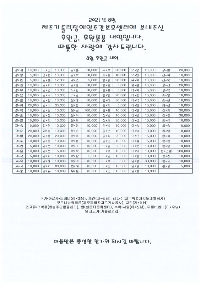 8월 후원금 및 후원물품 수입내역입니다.