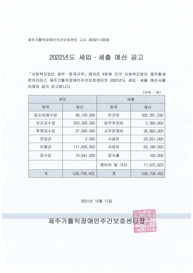 2022년도 세입세출 예산(안)을 다음과 같이 공고합니다.