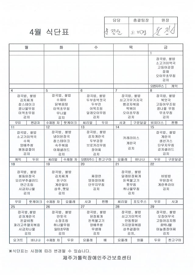 4월 식단표 입니다