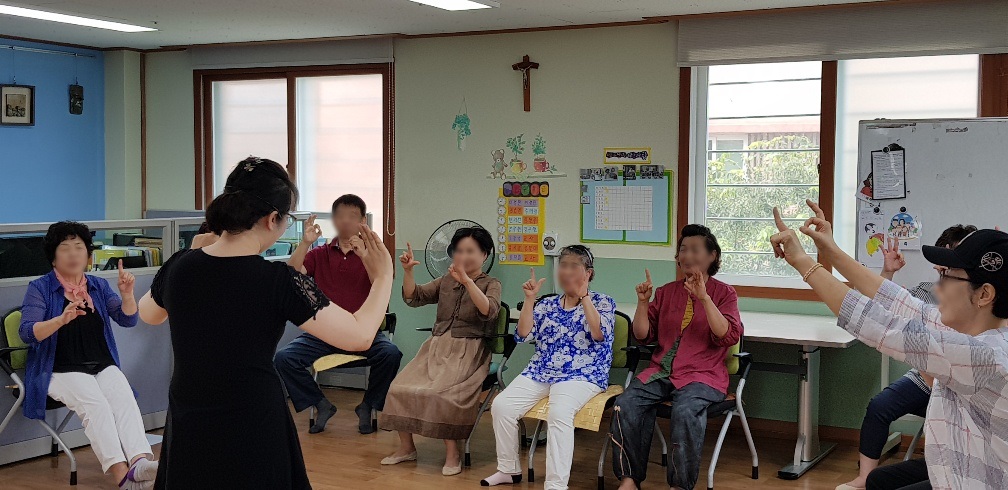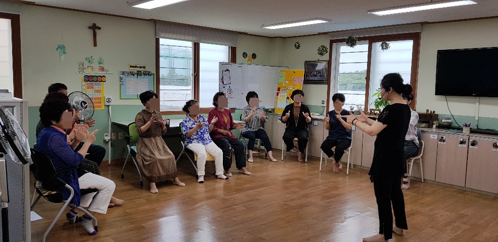 몸풀기, 뇌체조, 힐링건강체조, 라인댄스 순으로 몸을 움직여가며 웃다보니 어느새 부모님들 얼굴이 환하게 피었습니다.