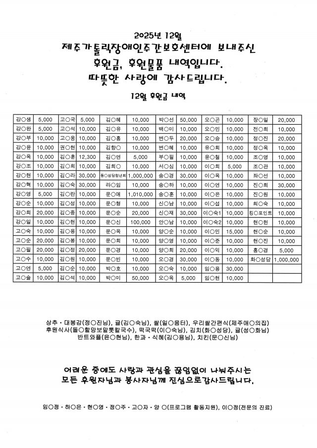 • 제목 12월 후원금 및 후원물품 내역