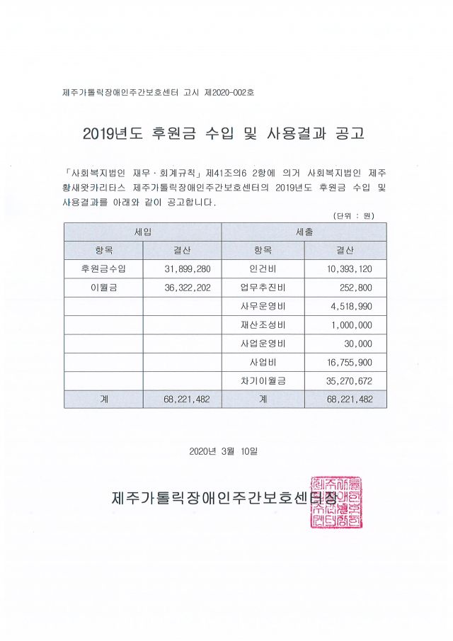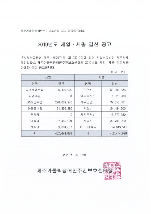 2019년도 제주가톨릭장애인주간보호센터 세입세출 결산내역을 공고합니다.