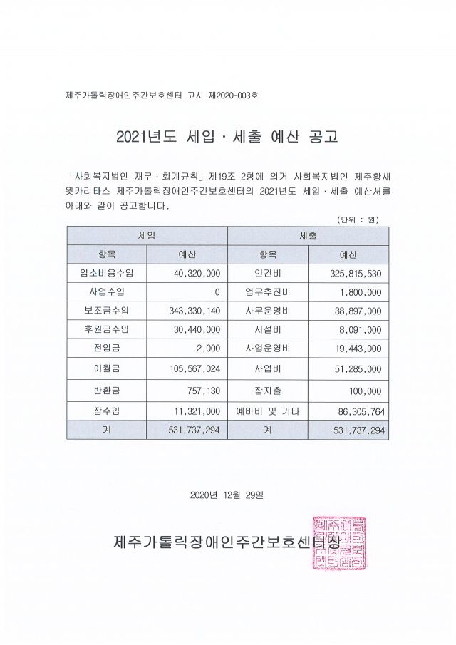 2021년도 제주가톨릭장애인주간보호센터 세입세출 예산안을 붙임과 같이 공고합니다.
