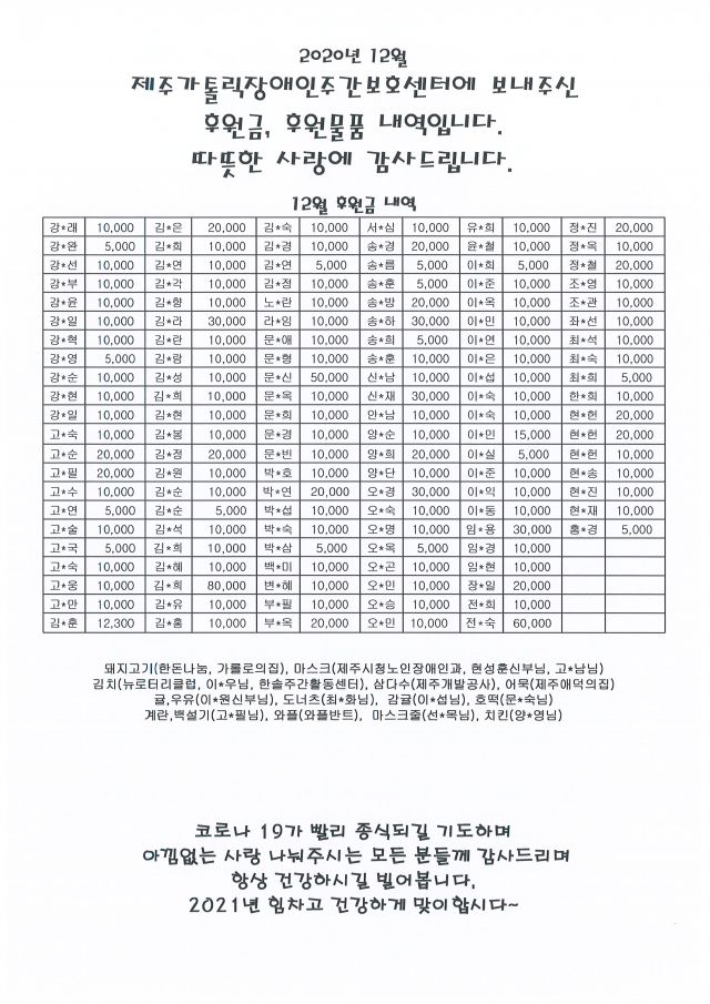 12월 제주가톨릭장애인주간보호센터에 도움주신 분들입니다. 감사드립니다~