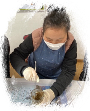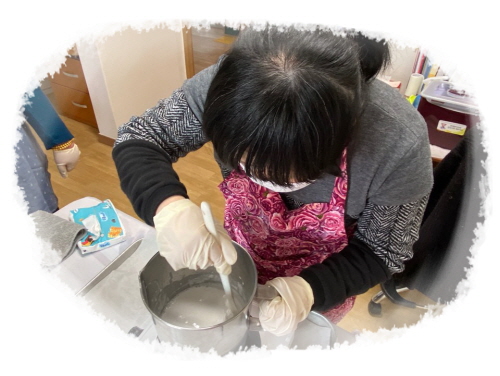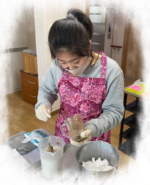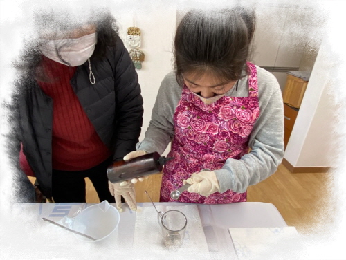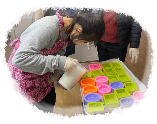직접 비누베이스를 썰고, 녹이고 재료를 계량하고 섞는 등 하여 비누가 완성되는