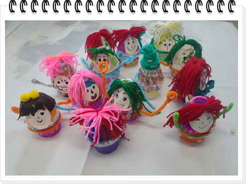미술활동으로 바나나우유병과 리본, 모루, 눈알스티커 등 다양항 재료를 이용하여