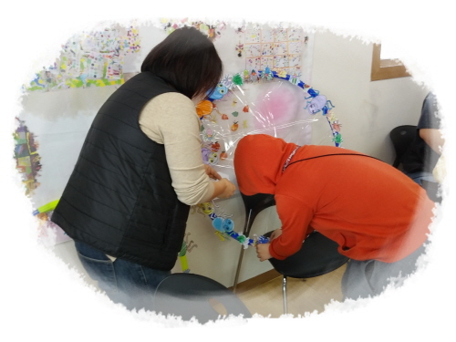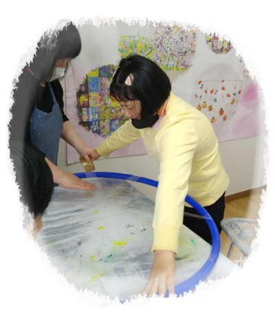 미술활동으로 훌라후프와 테이프를 이용하여 끈적끈적한 거미줄을 만들어