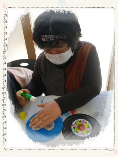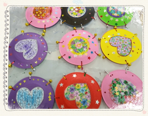 미술활동으로 종이접시와 빵끈, 작은방울을 이용하여 탬버리 만들어