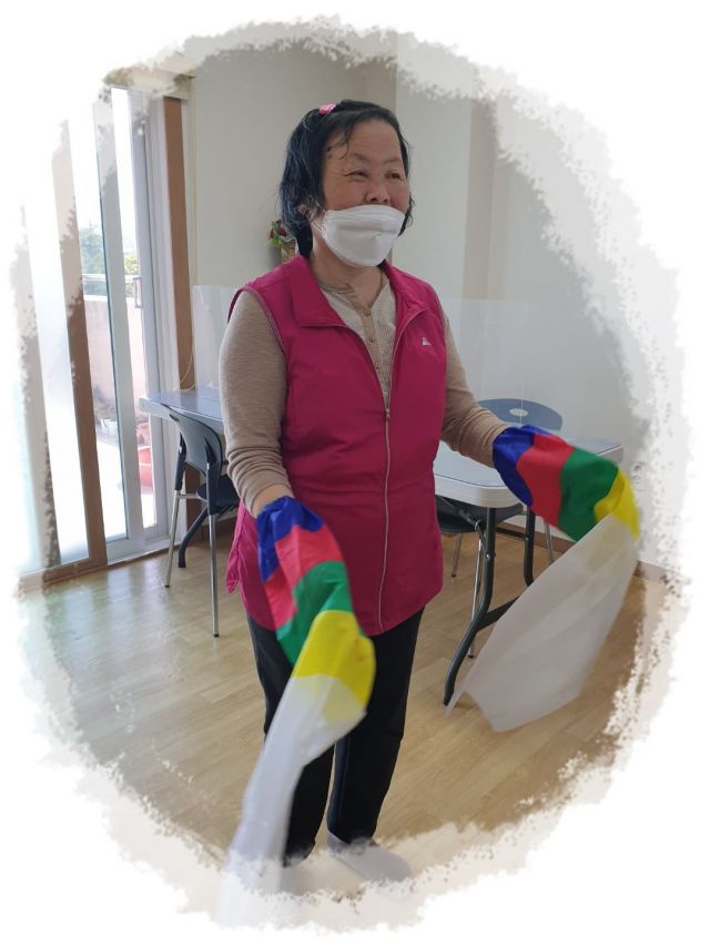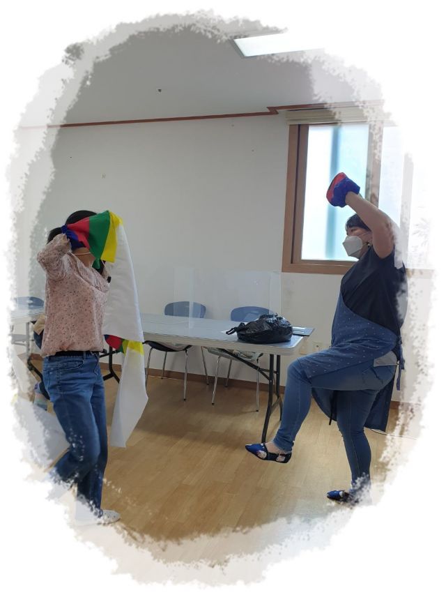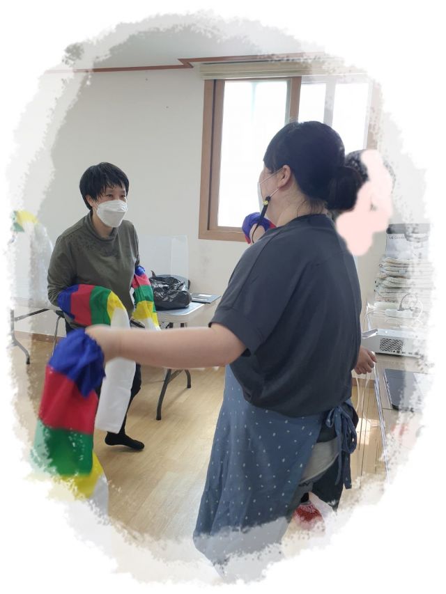 교사의 시범을 보며 한삼놀이 활동 했습니다