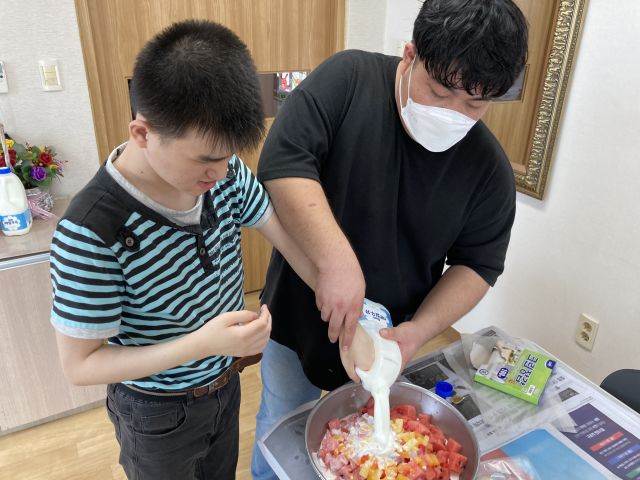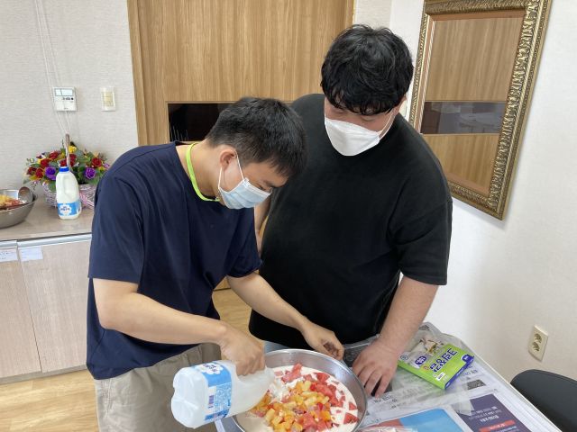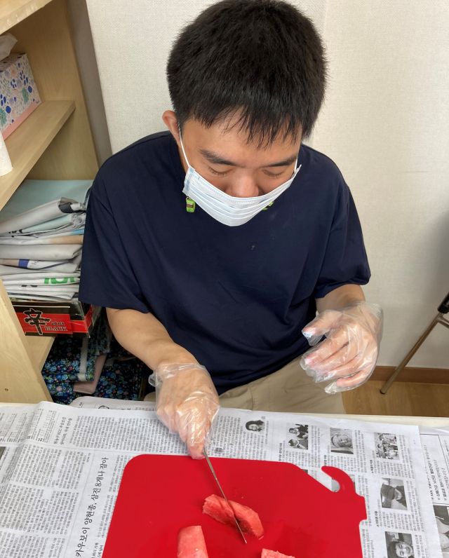 금일 1반 체험활동으로 수박화채를 잘라보고 직접 재료를 넣어본 후 이용인들과 함께 맛있게 먹는 시간을 가졌습니다.