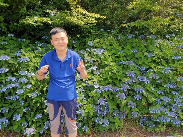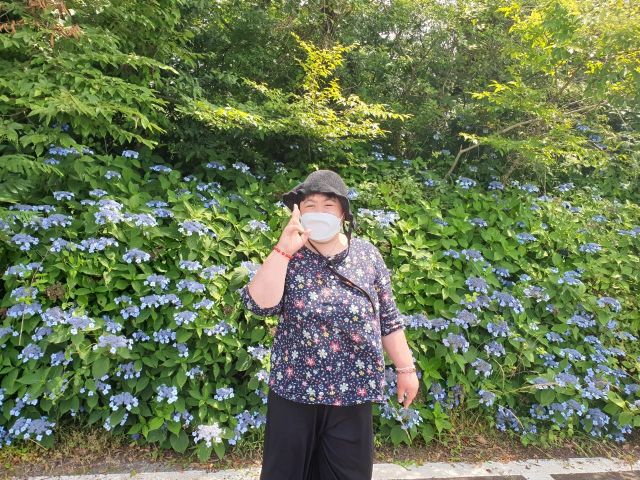 항상 앉던 아지트에 오늘은 지역주민이 앉아 있어서 . . .산책길 삥 돌아 수국이 핀 곳에서 사진 한 컷 찍어 보았습니다.