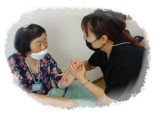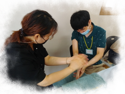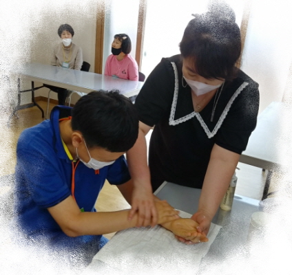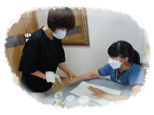 피부미용기초로 선생님들과 서로 인사를 나누고 손맛사지는 어떻게 하는지 등에 배우고 체험하는 시간을 가졌습니다.