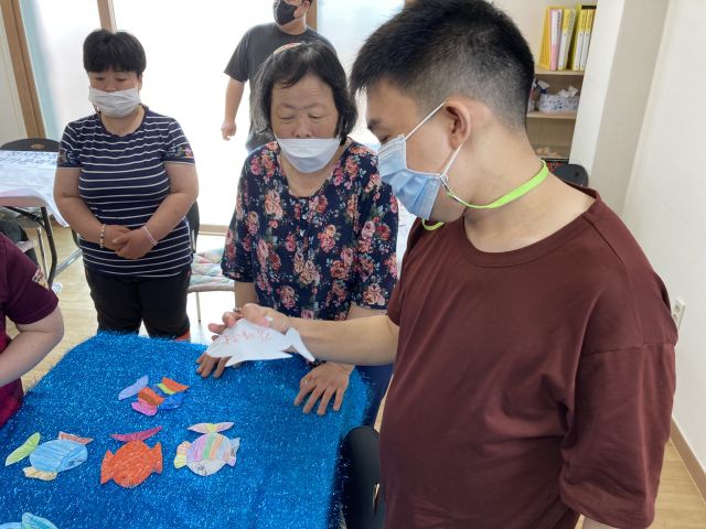 금일 여가활동 시간에는 감기 걸린 물고기 동화구연을 듣고 이용인분들이 직접 알록달록한 물고기를 꾸며본 후 클립과 자석을 이용하여 낚시 놀이를 하는 시간을 가졌습니다.