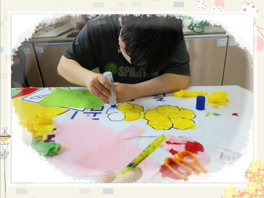 다양한 색의 한지를 찢어 무궁화 꽃을 꾸몄습니다.