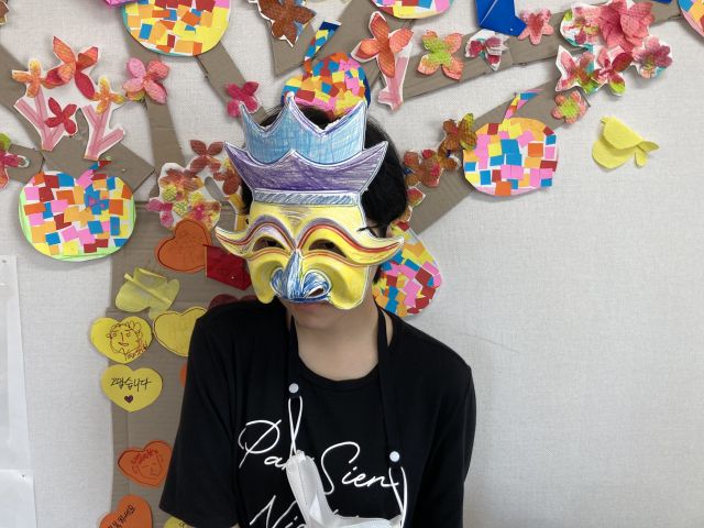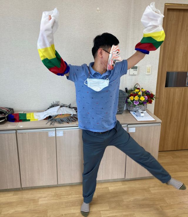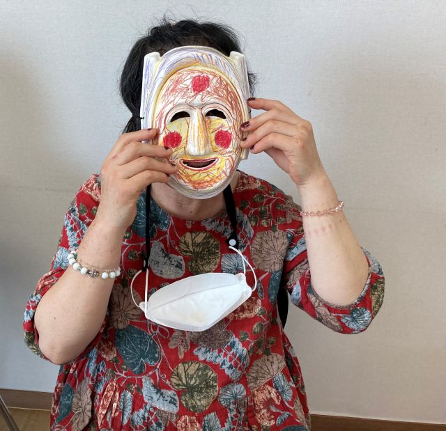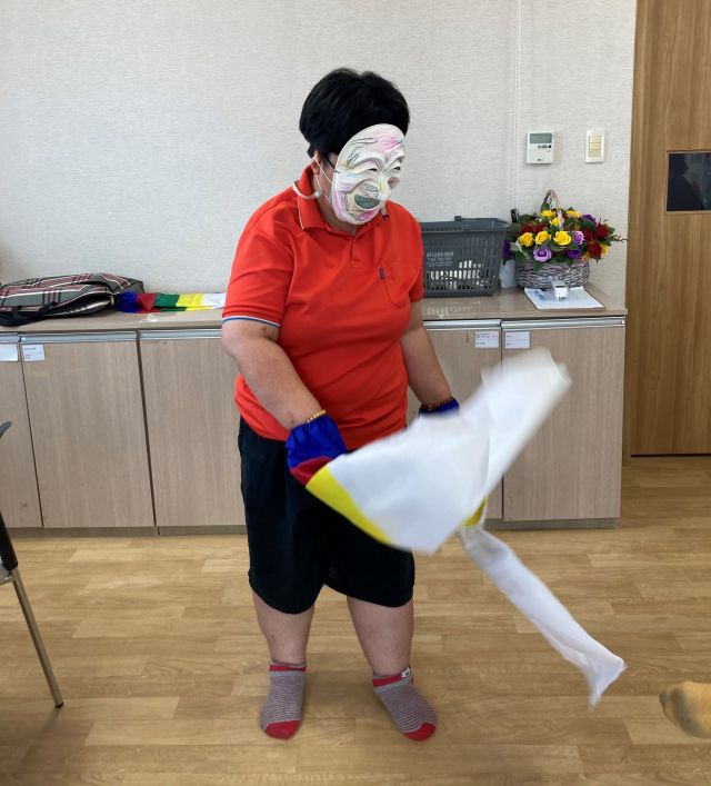 금일 여가활동 시간에는 봉산 탈 사자춤 동화구연을 감상하였습니다. 이용인분들이 색연필을 이용하여 탈을 아름답게 꾸며 한삼을 끼고 각시탈, 하회탈, 양반탈 등을 써서 덩기덕쿵덕 리듬에 맞춰 춤을 춰보는 시간을 가졌습니다.