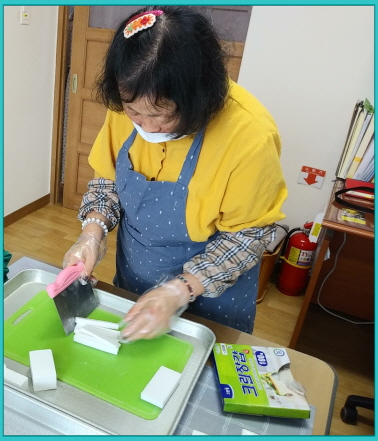 날씨가 더워 천비누만들기에는 어려움이 있어 비누베이스 깍둑썰기 연습을 하였습니다.