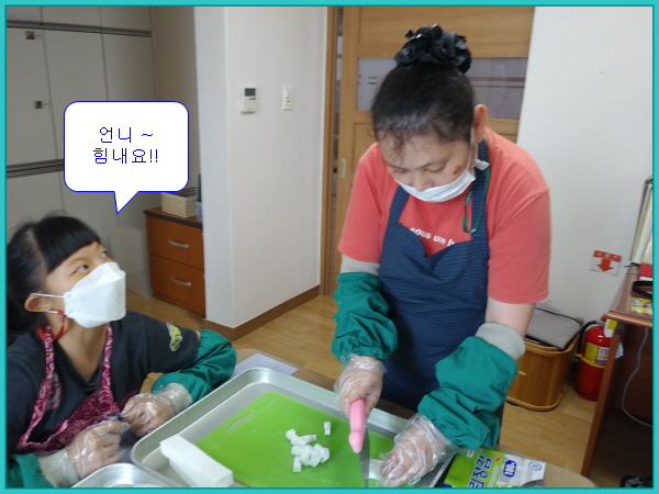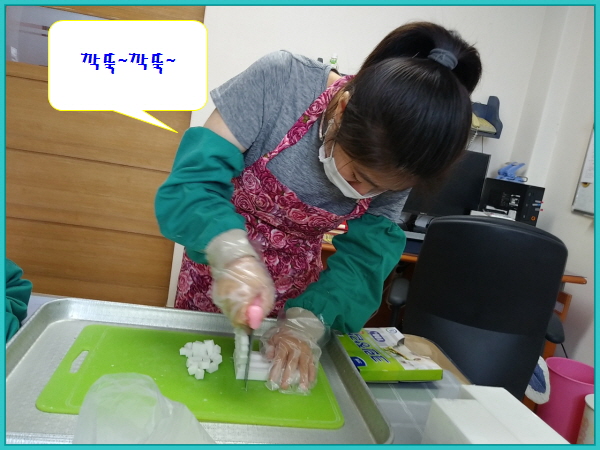 마스크, 앞치마, 덧소매, 위생장갑을 착용하고 한명씩 교사의 지원 하에 천천히~ 조심~ 조심 ~ 썰기 연습을 하였습니다.