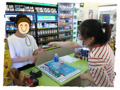 "계산해주세요". "감사합니다", "고맙습니다"라고 감사인사를 하고 구입한 간식을