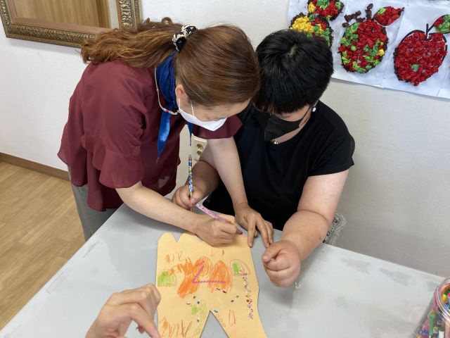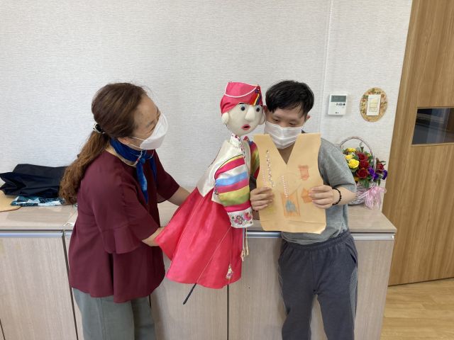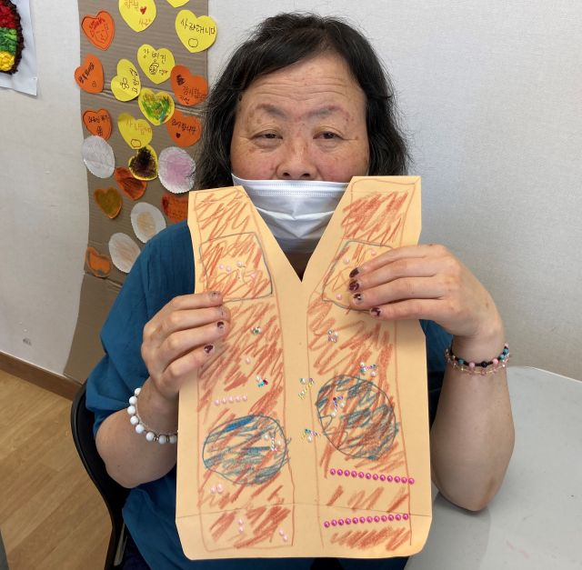 금일 여가활동 시간에는 강사님이 이용인분들에게 종이봉지공주 동화구연을 들려주고 각대봉투와 각종 반짝이 스티커, 다양한 색깔의 색연필 등을 이용해 이용인들이 자신만의 멋지고 예쁜 종이봉지 옷을 만들어 보는 시간이였습니다.