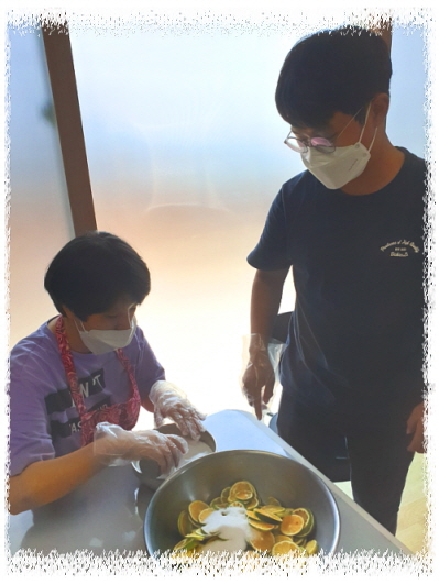 칼 사용이 위험하여 칼로 써는 부분은 교사의 도움을 받고 진행하였습니다. 썰어 놓은 청귤에 설탕과 올리고당 넣고