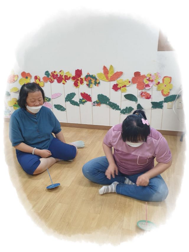 팽이를 곱게 색칠해 뱅글뱅글 돌려보았습니다.