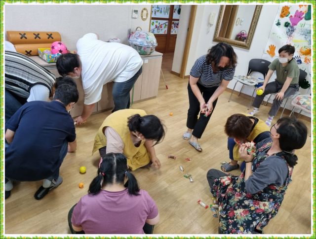 박을 터트리자 과자가 펑!하고 쏱아져 다같이 줍고 나눠먹었습니다.