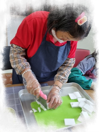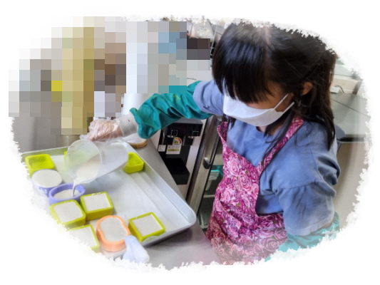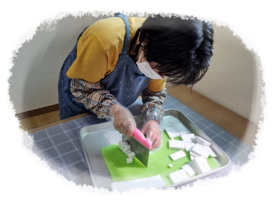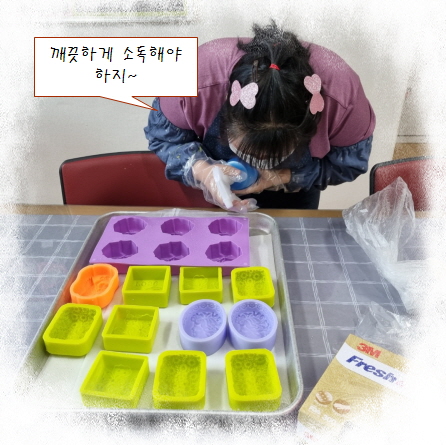 몰딩 소독하기, 비누베이스 썰기, 비누베이스 녹이기, 재료 계량하여 섞기, 녹은 비누베이스와 재료를 넣고 잘 저어