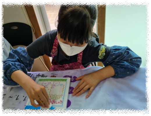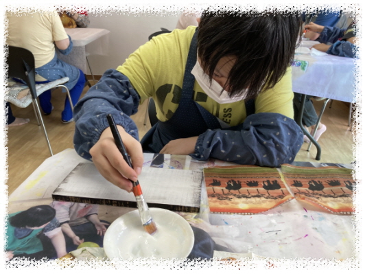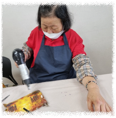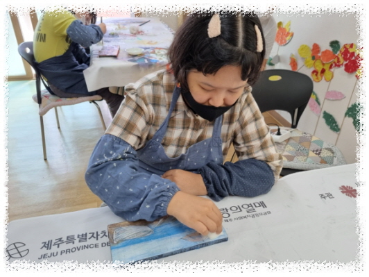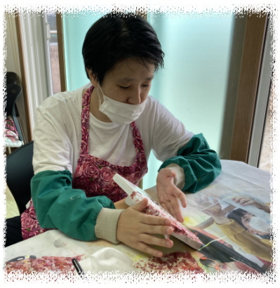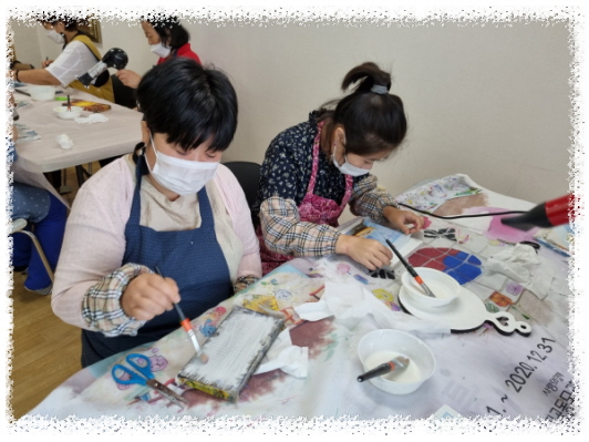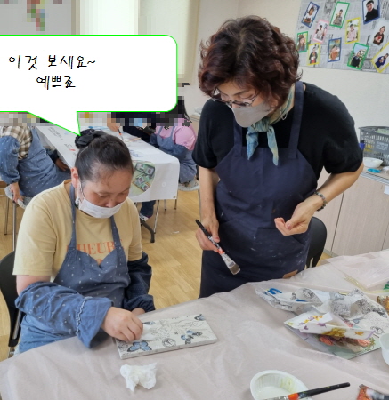 냅킨, 물감, 반짝이를 활용하여 붙이고, 칠하고, 반짝이를 뿌려 드라이로 건조 후 마감재 바르면