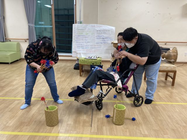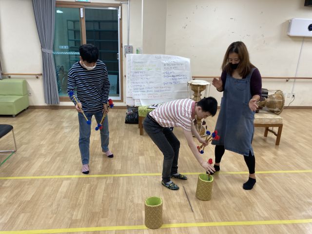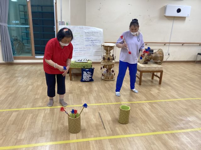 금일은 사랑가, 강강술래 등 다양한 음악에 맞춰 소고연주를 해보고 두 명씩 그룹을 만들어 투호놀이를 하여 즐거운 전통놀이활동 시간이 되었습니다.