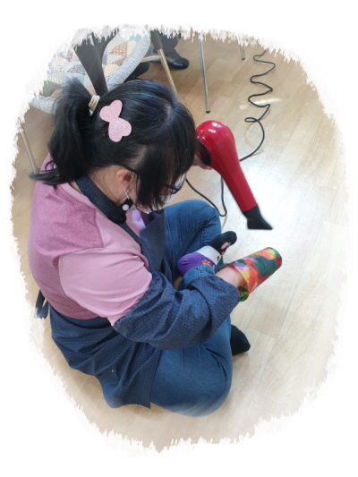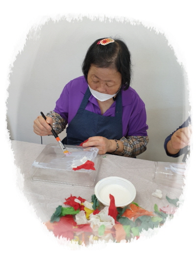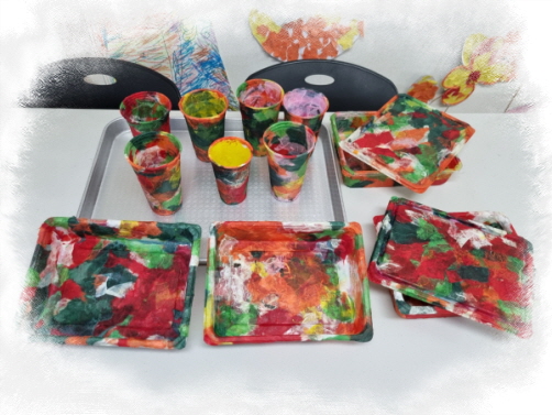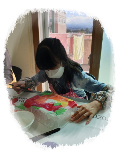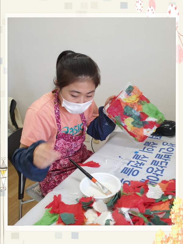 폐품공예활동(재활용아트)으로 일회용컵과 샐러드용기에 한지를 붙여 다용도 정리함을 만들었습니다.