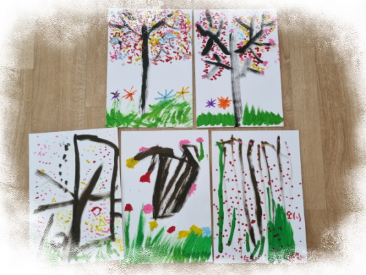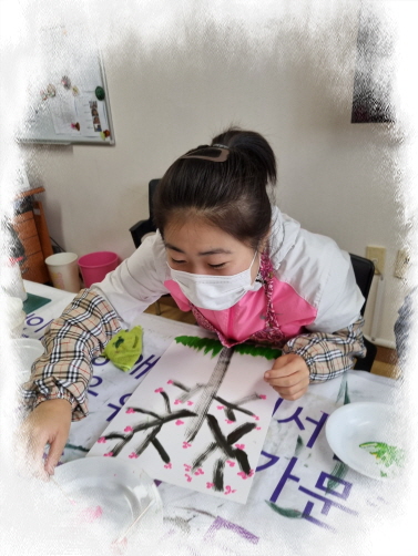다양한 색깔를 면봉이나 손가락으로 찍어 벚꽃나무를 표현하였스빈다.