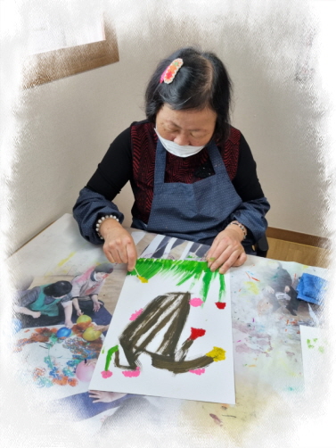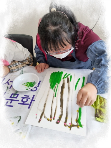 재능키움활동으로 칫솔과 면봉으로 이용하여 손가락으로 칫솔을 잡아 뿌기리거나 칫솔를 붓처럼 사용하여 나무를 표현하여