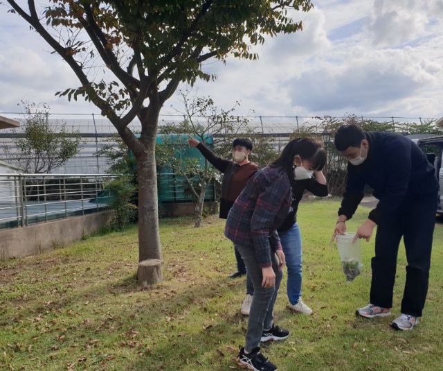 1층 정원에서 가을 낙엽을 줍고