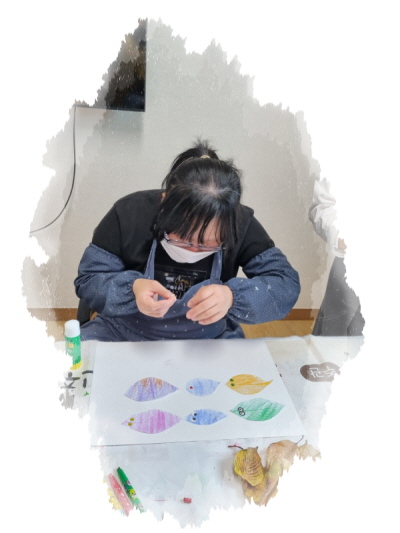 다양한 나뭇잎으로 여러가지 색깔로 문지른 후 오려 나비, 해바라기, 하트, 토끼, 물고기 등