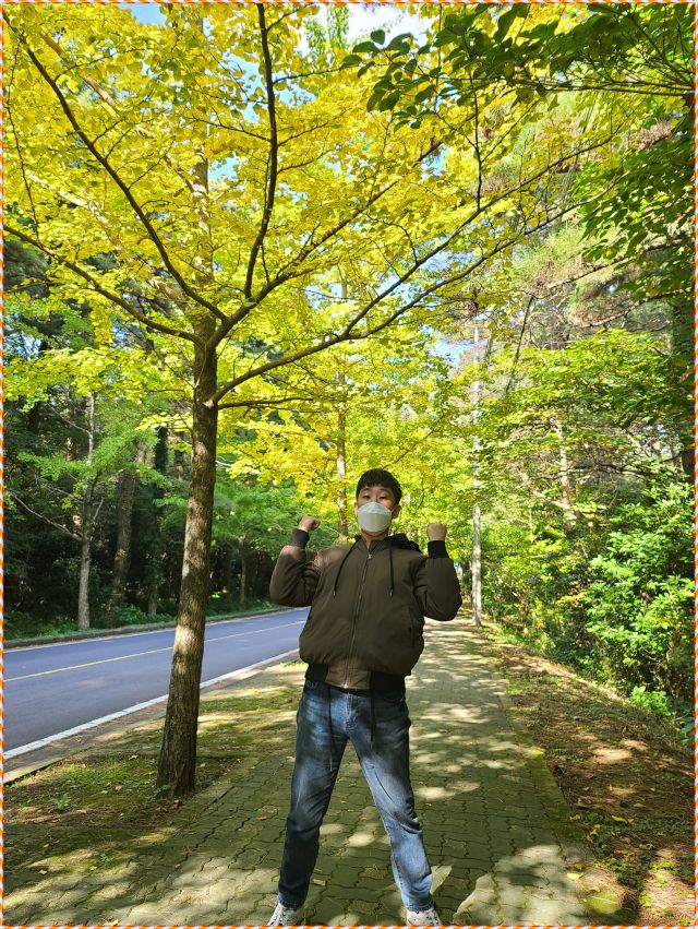 산책로에 떨어진 은행나뭇잎을 줍고 자유롭게 산책하며