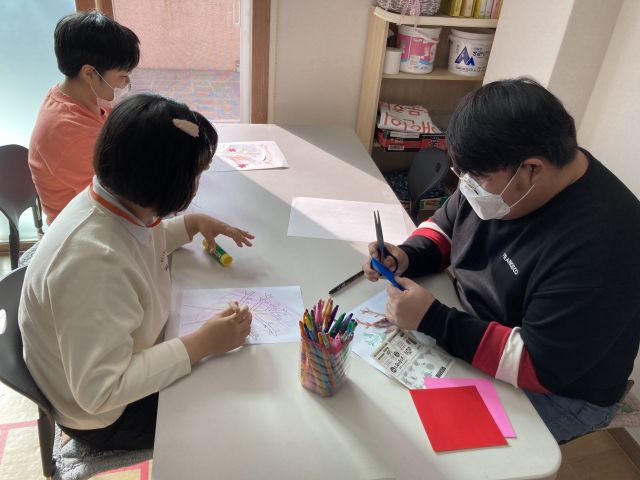 금일 여가활동 시간에는 나무도안을 꾸미고 잘라 색연필로 색칠하거나 색종이로 나뭇잎을 꾸며 참여자들만의 나무호텔을 만들어 보았습니다.