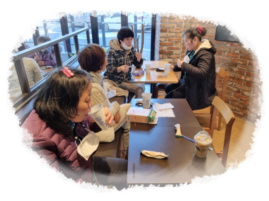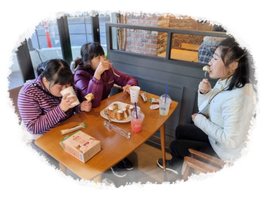 체험활동으로 다이소에서 물건을 구입하여 커피숍에서 티타임을 가졌습니다.