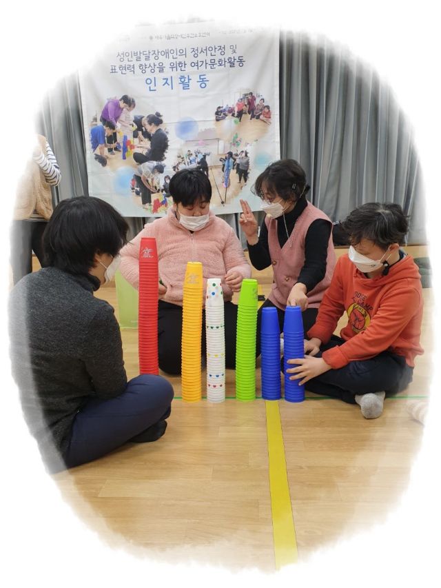 컵을 두들기며 연주하기, 팔을 돌려 스트레칭 하기, 30*30판에 컵 쌓기 활동 진행하였습니다.