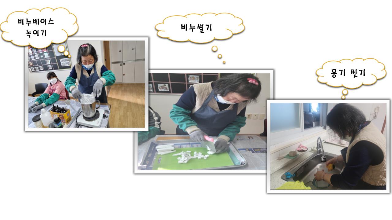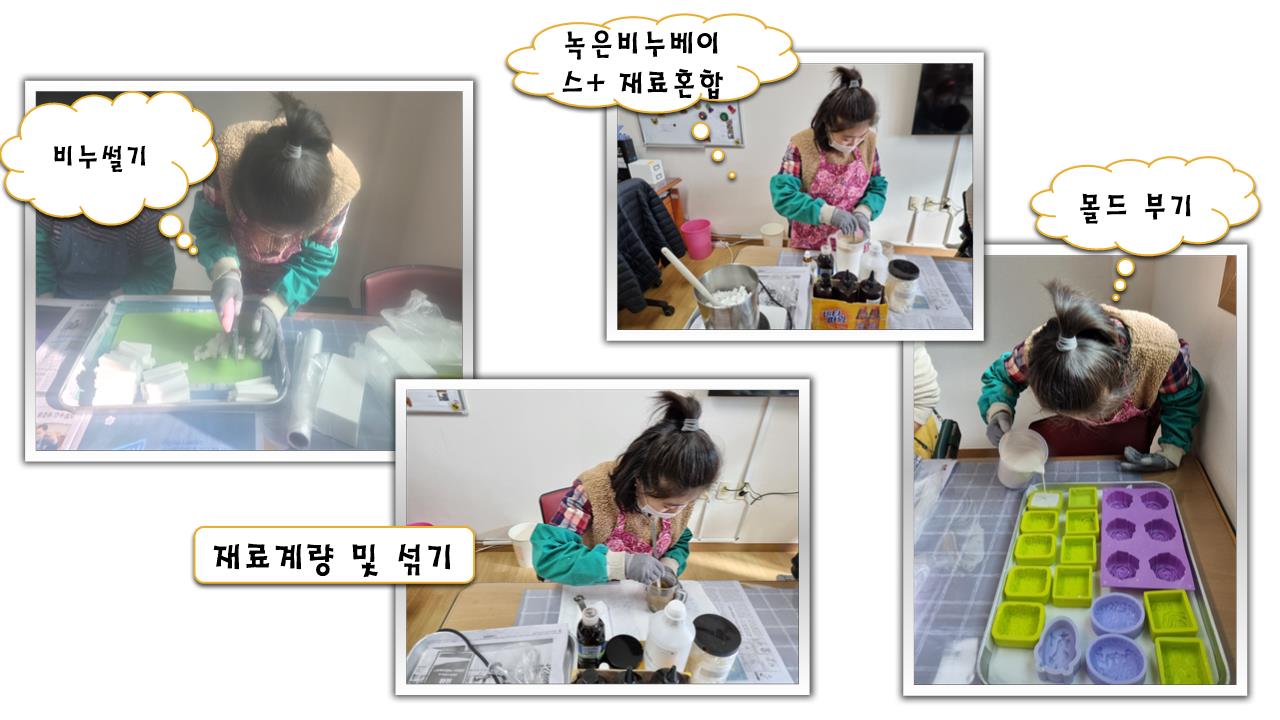 재료계량하기 → 비누베이스 썰기 → 녹은 비누베이스에 재료 혼합하기 → 몰드 부고 건조하면 완성~
