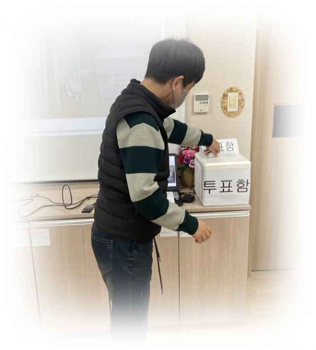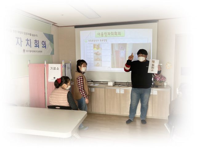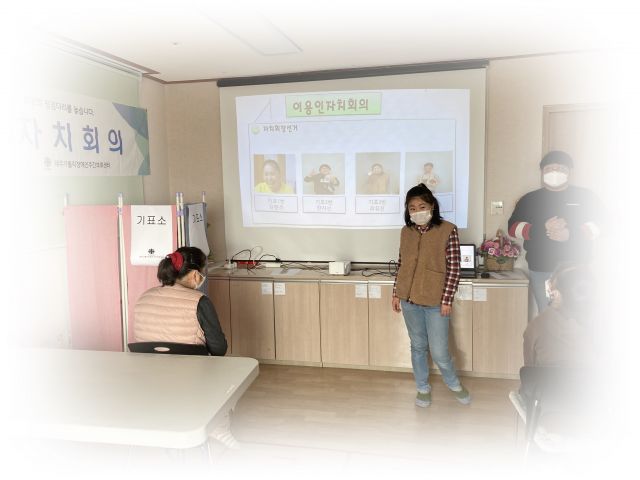 이용인자치회의를 진행하였습니다.회의 내용은 2022년도 이용인자치회장 선출이며