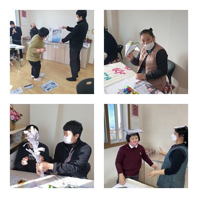 한 손은 등 뒤, 한 손으로 신문지 구겨 소근육 강화, 다양한 크기로 접어 머리 위에 올려 균형잡고 걷기