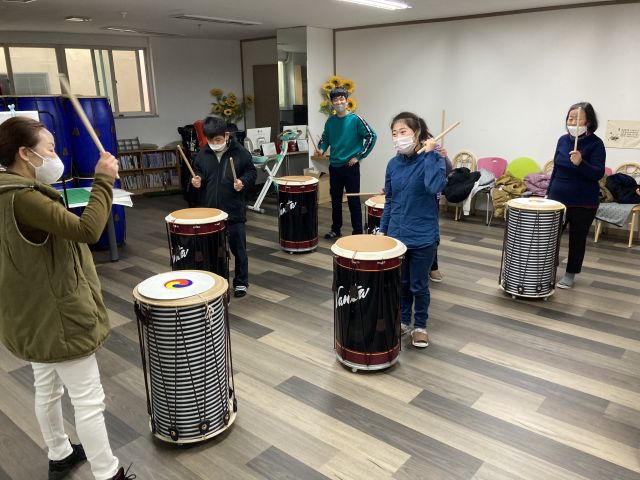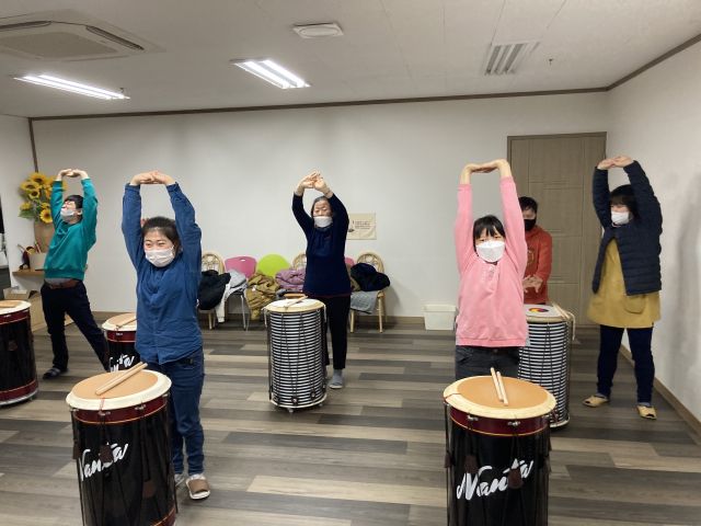 금일 난타활동으로 네박자, 한잔해, 내 나이가 어때서, 아기염소 등 다양한 음악에 맞춰 스트레칭과 난타연주를 하며 즐거운 시간 보냈습니다.