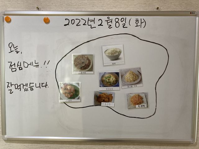 금일 점심메뉴는 맛있는~~ '밥, 잡곡밥, 우거지국, 닭볶음탕, 무우생채, 콩나물 무침, 김치' 입니다. 맛있게 잘 먹겠습니다~