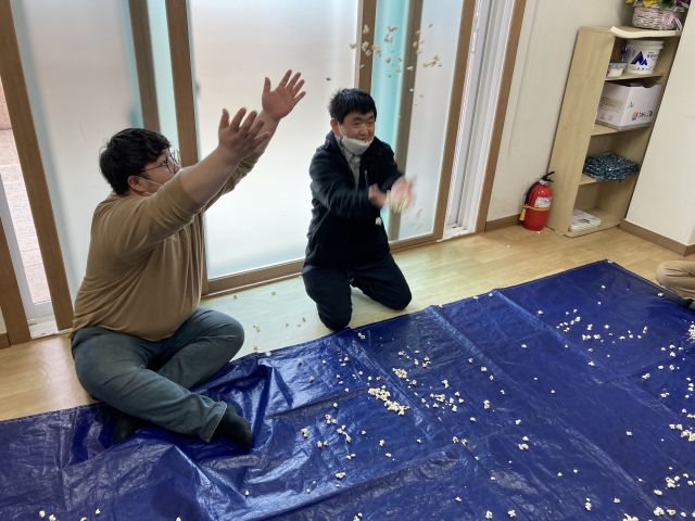 금일 오감체험활동으로 팝콘을 이용하여 만져보고 냄새를 맡아보고 맛을 느껴보며 소감을 말하고 다양한 게임을 해보고 팝콘을 뭉쳐 높게 던져보며 눈이 오는 상상을 해보며 즐거운 시간을 보냈습니다.