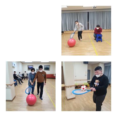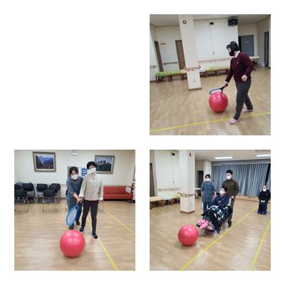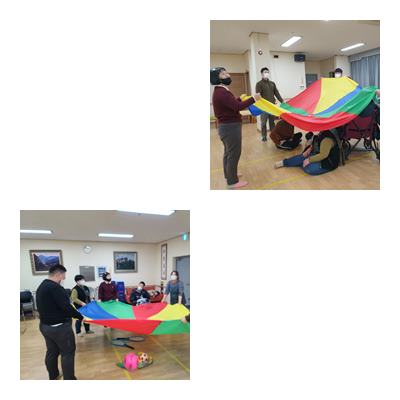 파라슈트 흔들어 바람 일으키기. 공 모으고 튕기기, 라켓을 이용해 다양한 크기의 공 굴리기, 이동하기 활동을 진행하였습니다.