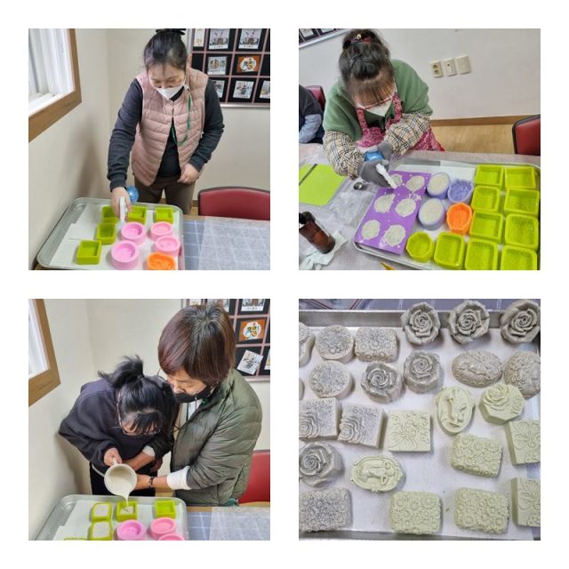 생태환경활동으로 원두찌거기를 말려 em발효액과 베이킹파우더를 활용하여 커피주방비누만들기 하였습니다.