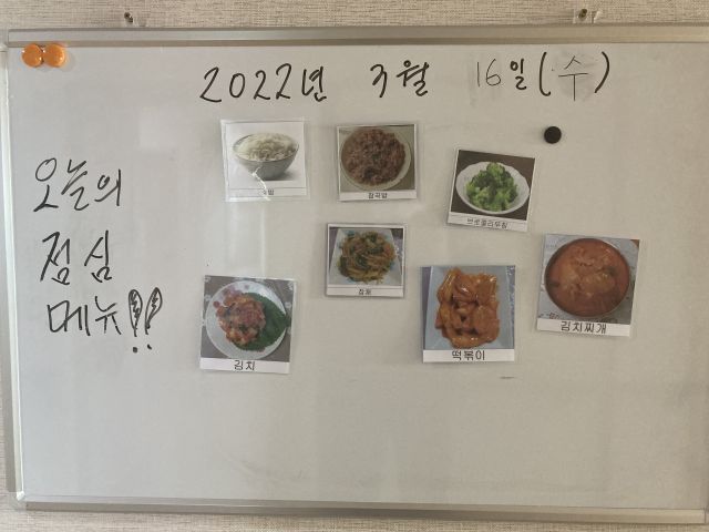 오늘의 점심메뉴는 밥, 잡곡밥, 김치, 떡볶이, 고추잡채, 브로콜리무침, 김치찌개 입니다.