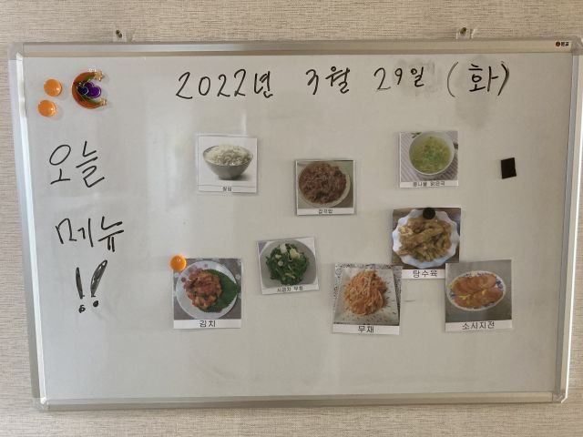 2022.3.29.화요일 점심메뉴는 탕수육, 시금치나물, 무우생채, 콩나물국, 소시시전입니다.