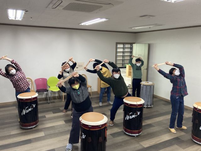금일은 한잔해, 네박자 등 다양한 트로트 음악에 맞춰 '덩' '덩덩' 덩짝' '덩덩짝짝' 등 다양한 장단으로 난타연주를 해보았습니다.